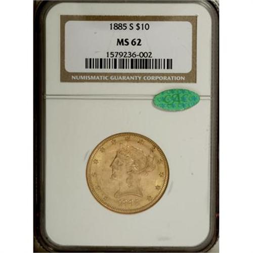 <B>1885-S $10 MS62 NGC. CAC.</B></I> Strongly lustrous despite the dusky qualities of the yellow-orange surfaces. Pleasingly detailed for this West Coast issue. Numerous light abrasions in the fields account for the grade.<BR><BR><B>Coin Engraver:</B> Christian Gobrecht<BR><BR><b>Shipping:</b> Coins & Currency (<a target="_blank" href="http://www.heritageauctions.com/common/shipping.php">view shipping information</a>)