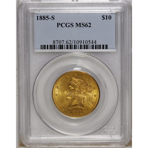 <B>1885-S $10 MS62 PCGS.</B></I> An originally toned mustard-gold Liberty ten that benefits from full luster and an attentive strike. A few moderate marks affect the obverse, but the coin is nonetheless cleaner than expected of the grade.<BR><BR><b>Shipping:</b> Coins & Currency (<a target="_blank" href="http://www.heritageauctions.com/common/shipping.php">view shipping information</a>)