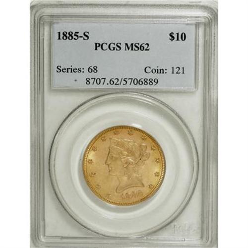 <B>1885-S $10 MS62 PCGS.</B></I> PCGS Population (258/77). NGC Census: (163/39). Mintage: 228,000. Numismedia Wsl. Price for NGC/PCGS coin in MS62: $835. (#8707)<BR><BR><B>Coin Engraver:</B> Christian Gobrecht<BR><BR><b>Shipping:</b> Coins & Currency (<a target="_blank" href="http://www.heritageauctions.com/common/shipping.php">view shipping information</a>)