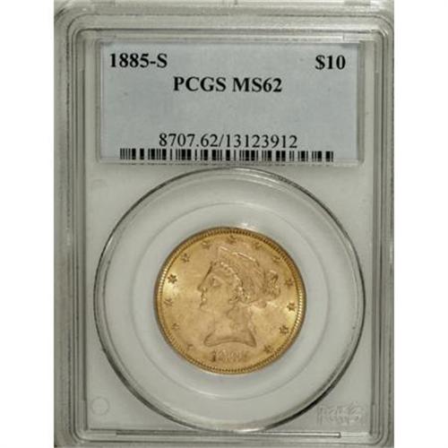 <B>1885-S $10 MS62 PCGS.</B></I> An intricately struck example that boasts comprehensive luster and a peach-toned reverse. The cheek and obverse field show abrasions, while the reverse is impressively smooth for the grade.<BR><BR><B>Coin Engraver:</B> Christian Gobrecht<BR><BR><b>Shipping:</b> Coins & Currency (<a target="_blank" href="http://www.heritageauctions.com/common/shipping.php">view shipping information</a>)