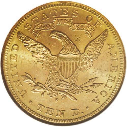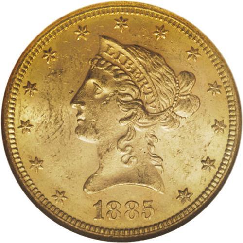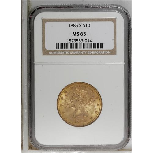 <B>1885-S $10 MS63 NGC.</B></I> The 1885-S is an unheralded conditional rarity with the Motto Liberty ten series. Notably bagmarked examples can be found with a minimal search, but pieces with full mint luster and only moderate abrasions are elusive. Census: 39 in 63, 1 finer (4/07).<BR><BR><b>Shipping:</b> Coins & Currency (<a target="_blank" href="http://www.heritageauctions.com/common/shipping.php">view shipping information</a>)