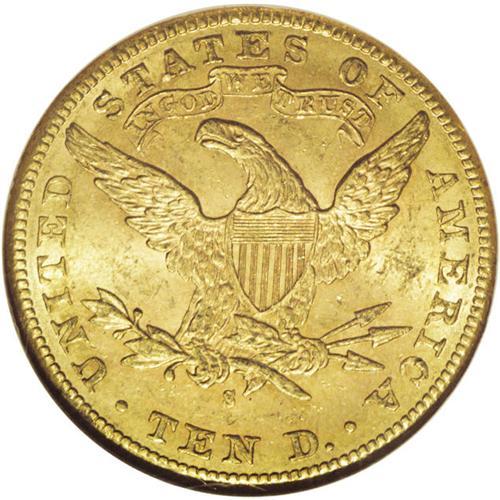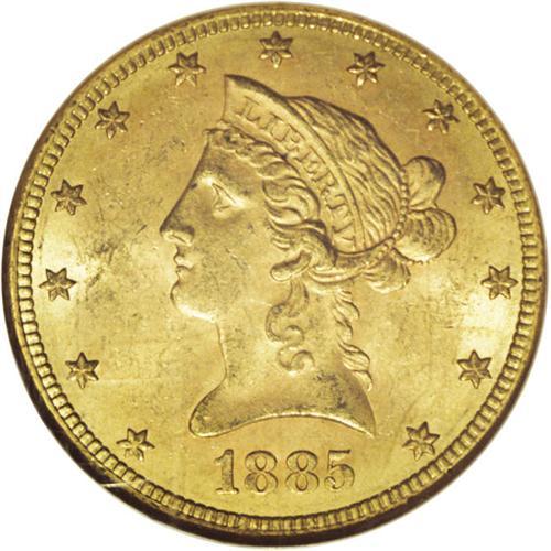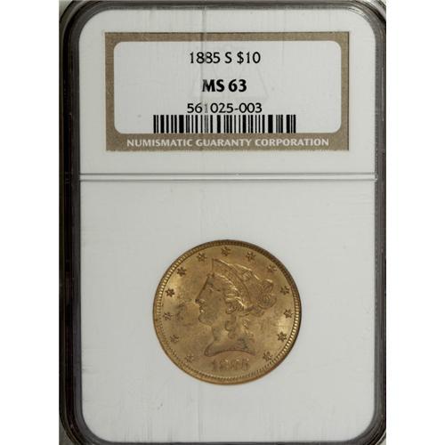 1885-S $10 MS63 NGC. The surfaces have a satiny, frost