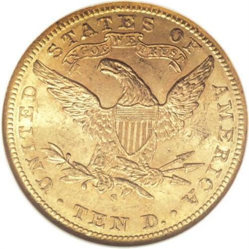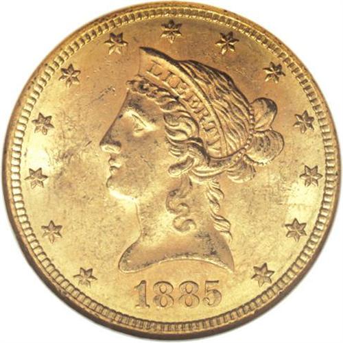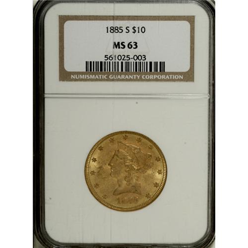 1885-S $10 MS63 NGC. The surfaces have a soft, frosty