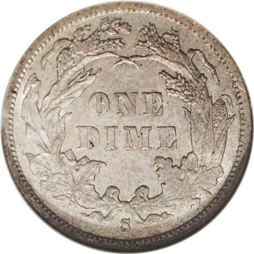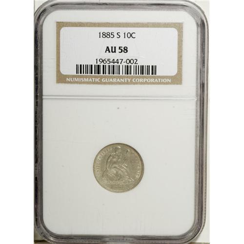 <B>1885-S 10C AU58 NGC.</B></I> A key mintmarked Seated dime that combines a low mintage (43,690) with condition rarity. Only a handful of Mint State pieces are known and this AU58 is a tiny bit away. Boldly struck throughout, the satiny fields display light gray-gold toning, which is slightly deeper on the reverse, and traces of luster in the recessed areas. A wispy linear mark in the right (facing) obverse field is mentioned for accuracy.<BR><BR><b>Shipping:</b> Coin/Currency (<a target="_blank" href="http://www.heritageauctions.com/common/shipping.php">view shipping information</a>)