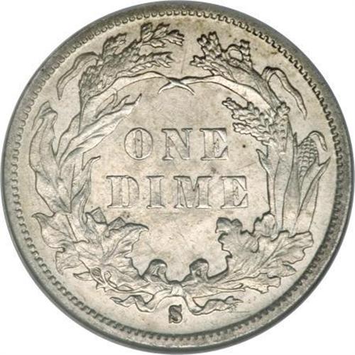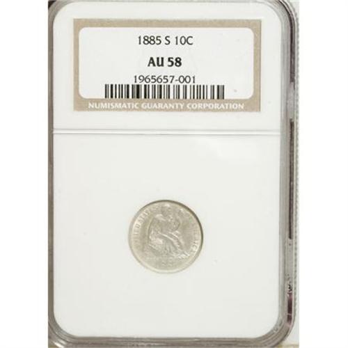 <B>1885-S 10C AU58 NGC.</B></I> With a mintage of only 43,690 pieces, the 1885-S is coveted in any grade, and a better circulated example commands a substantial premium. Though a touch of softness visits Liberty's head, the detail is solid elsewhere, and the gold-accented silver-gray surfaces retain the vast majority of their original luster. Only a trace of friction visits the highpoints. Census: 4 in 58, 15 finer (10/07).<BR><BR><B>Coin Engraver:</B> Christian Gobrecht<BR><BR><b>Shipping:</b> Coins & Currency (<a target="_blank" href="http://www.heritageauctions.com/common/shipping.php">view shipping information</a>)