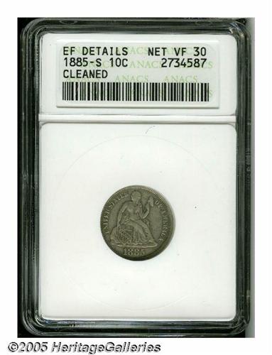 1885-S 10C --Cleaned--ANACS. XF Details, Net VF30