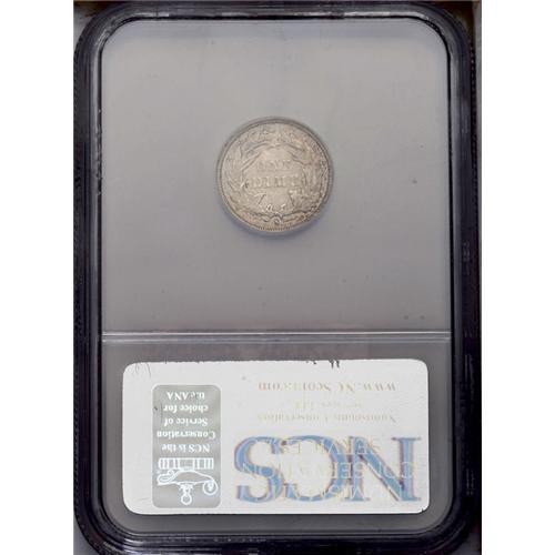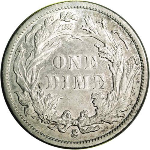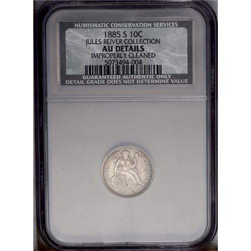 <B>1885-S<10C>--Improperly Cleaned--NCS. AU Details.</B></I> Bright silver surfaces with splashes of dark steel toning on the obverse and pale gold on the reverse. This is an attractive and extremely important Seated Dime, in spite of the minor hairlines that were generated when it was cleaned.