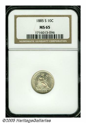 <B>1885-S<10C> MS65 NGC.</B></I> This is an extremely important opportunity for the advanced specialist as the '85-S dime is seldom available in any grade, and Gem quality examples are truly elusive. Fully lustrous with brilliant silver surfaces and satiny luster. Were it not for the faintest champagne toning, this would be brilliant white, and some would still call it such. Our Auction Archives reveal that we have only offered a Mint State example of this rarity five times in the past dozen years, and never before have we offered a Gem. If you've been seeking a Gem for your collection, now is not the time to be conservative. Step to the plate and take a swing. Population: 4 in 65, 1 finer (5/05).