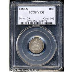 1885-S 10C VF35 PCGS. The low mintage '85-S has lo <B>1885-S 10C VF35 PCGS.</B></I> The low mintage '85-S has long been considered a key issue in the Seated Liberty Dime series. Only 43,690 pieces were struck of this issue, and survivors are sought out in all grades by collectors. This specimen is a light golden-brown. The design elements show relatively nice detail, except that potions of the wreath, and Liberty's head are weak. There are no marks of any consequence. Population: 3 in 35, 19 finer (10/04). <BR><BR><B>Important notice:</B> Heritage usually auctions material at the rate of 200-250 lots per hour. On some occasions eBay Live bid software or the Internet may not be able to keep up with the pace of the auction. We recommend placing a realistic absentee bid now as insurance to avoid disappointment. Occasionally the auctioneer may eliminate or reject an eBay Live bid, and the auctioneer may also reopen a lot after the close of the eBay live bidding (usually because we missed an audience bid), and may reject your bid even if it shows you as the winning bidder. By bidding via eBay Live, you agree that Heritage may award the lot to another bidder at its sole discretion under the circumstances described above or any other reasonable circumstances. Since eBay bids are not shown to us until we open the lot on the floor, we treat those bids just like floor bids. In most cases the floor responds before the eBay bid is presented to us, due to Internet lag time, so for consistency we have made it a policy that floor bids are always considered first over tie eBay live bids. Also please note that all Heritage lots purchased through eBay Live carry a 20% Buyer's Premium. Please make sure you read the Terms and Conditions before you bid. This lot is being auctioned in conjunction with a live floor auction by Heritage Galleries & Auctioneers. All final auction and invoice information will be supplied by Heritage Galleries & Auctioneers, and all other information should be considered preliminary. Lot:5726