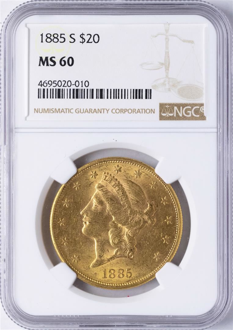One 1885-S $20 Liberty Head Double Eagle Gold Coin NGC MS60. NGC Certified.