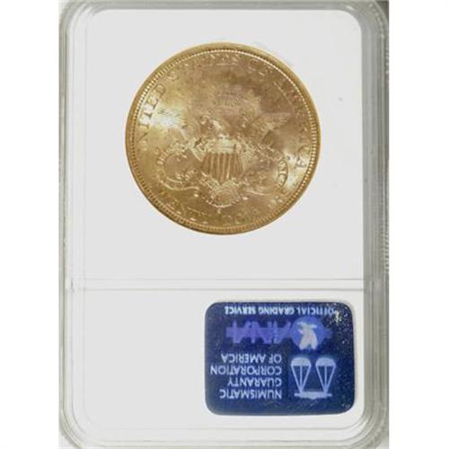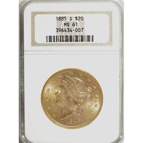 <B>1885-S $20 MS61 NGC.</B></I> NGC Census: (708/690). PCGS Population (351/921). Mintage: 683,500. Numismedia Wsl. Price for NGC/PCGS coin in MS61: $910. (#9005)<BR><BR><B>Coin Engraver:</B> James B. Longacre<BR><BR><b>Shipping:</b> Coins & Currency (<a target="_blank" href="http://www.heritageauctions.com/common/shipping.php">view shipping information</a>)