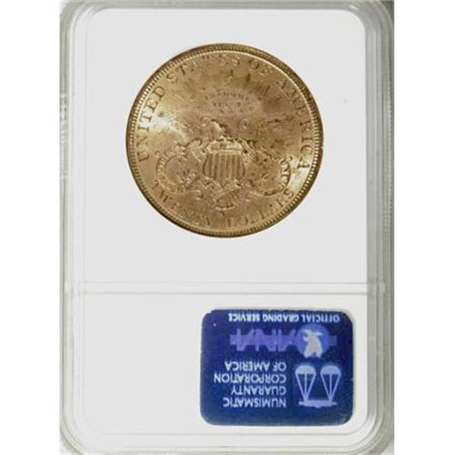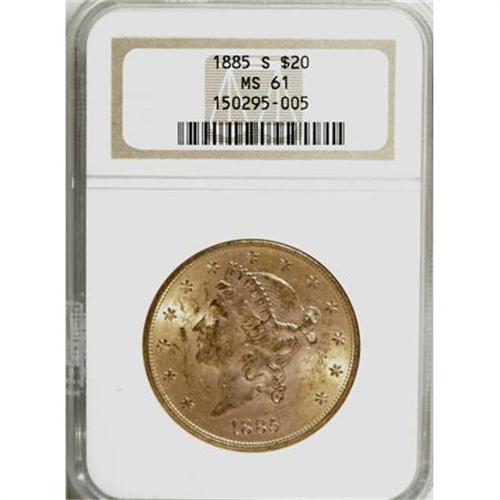 <B>1885-S $20 MS61 NGC.</B></I> NGC Census: (708/690). PCGS Population (351/921). Mintage: 683,500. Numismedia Wsl. Price for NGC/PCGS coin in MS61: $910. (#9005)<BR><BR><B>Coin Engraver:</B> James B. Longacre<BR><BR><b>Shipping:</b> Coins & Currency (<a target="_blank" href="http://www.heritageauctions.com/common/shipping.php">view shipping information</a>)