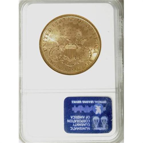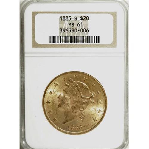 <B>1885-S $20 MS61 NGC.</B></I> NGC Census: (708/690). PCGS Population (351/921). Mintage: 683,500. Numismedia Wsl. Price for NGC/PCGS coin in MS61: $910. (#9005)<BR><BR><B>Coin Engraver:</B> James B. Longacre<BR><BR><b>Shipping:</b> Coins & Currency (<a target="_blank" href="http://www.heritageauctions.com/common/shipping.php">view shipping information</a>)