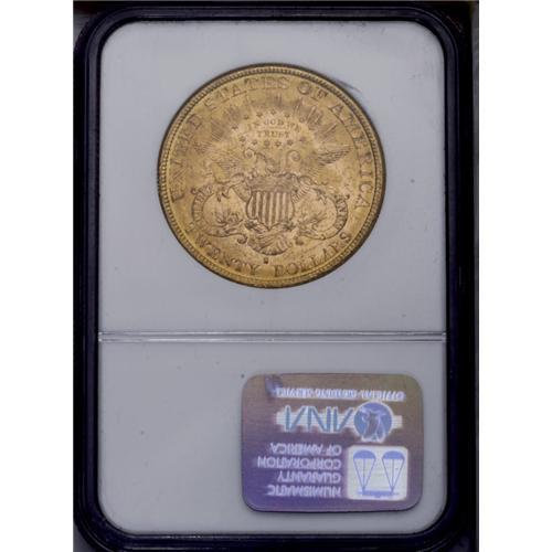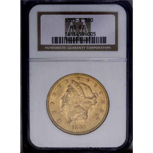 <B>1885-S<$20> MS62 NGC.</B></I> Thick luster, but several slight abrasions on the obverse surfaces, most notably on Liberty's cheek, preclude the Select grade. <BR><BR><B>Important notice:</B> Heritage usually auctions material at the rate of 200-250 lots per hour. On some occasions eBay Live bid software or the Internet may not be able to keep up with the pace of the auction. We recommend placing a realistic absentee bid now as insurance to avoid disappointment. Occasionally the auctioneer may eliminate or reject an eBay Live bid, and the auctioneer may also reopen a lot after the close of the eBay live bidding (usually because we missed an audience bid), and may reject your bid even if it shows you as the winning bidder. By bidding via eBay Live, you agree that Heritage may award the lot to another bidder at its sole discretion under the circumstances described above or any other reasonable circumstances. Since eBay bids are not shown to us until we open the lot on the floor, we treat those bids just like floor bids. In most cases the floor responds before the eBay bid is presented to us, due to Internet lag time, so for consistency we have made it a policy that floor bids are always considered first over tie eBay live bids. Also please note that all Heritage lots purchased through eBay Live carry a 20% Buyer's Premium. Please make sure you read the Terms and Conditions before you bid. This lot is being auctioned in conjunction with a live floor auction by Heritage Galleries & Auctioneers. All final auction and invoice information will be supplied by Heritage Galleries & Auctioneers, and all other information should be considered preliminary. Lot:4305 <BR><BR><B>Winning Notification and Billing:</B> After the FINAL session in this auction is complete, Heritage will send e-mail and snail mail invoices. This process normally takes several days. All final auction and invoice information will be supplied by Heritage Galleries & Auctioneers, and all other information should be considered preliminary. <BR><BR>This auction will be conducted on a live auction floor and over the Internet through eBay Live. If you choose to place an absentee bid, please take a moment to <font color='#0000ff'><u><a href='http://pages.ebay.com/liveauctions/help/before/laabsentee.html'>learn how eBay Live absentee bidding works</a></u></font><font color='#000000'>