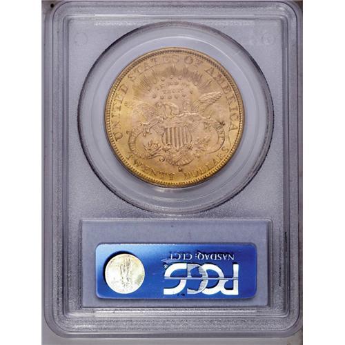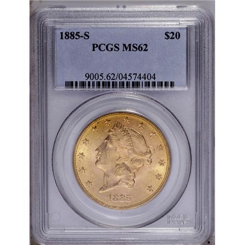 <B>1885-S<$20> MS62 PCGS.</B></I> An attentively struck representative of this popular large denomination gold type. Handling marks on the cheekbone and at 4 o'clock on the reverse decide the grade.