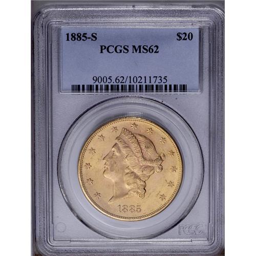 <B>1885-S<$20> MS62 PCGS.</B></I> Highly lustrous and nicely struck, with dancing cartwheels in the fields and pleasing green-gold and pink-rose toning. Minor scattered abrasions define the grade.