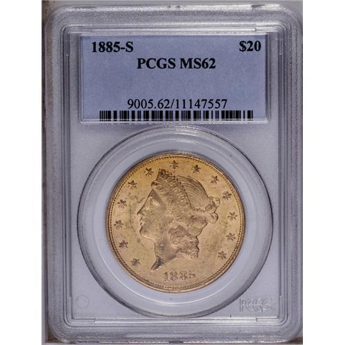 <B>1885-S<$20> MS62 PCGS.</B></I> Boldly struck with prooflike fields and appealing green-gold and rose toning. Numerous small abrasions limit the grade.