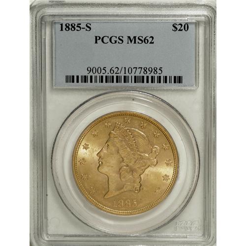 1885-S $20 MS62 PCGS. Solidly struck in the centers wi