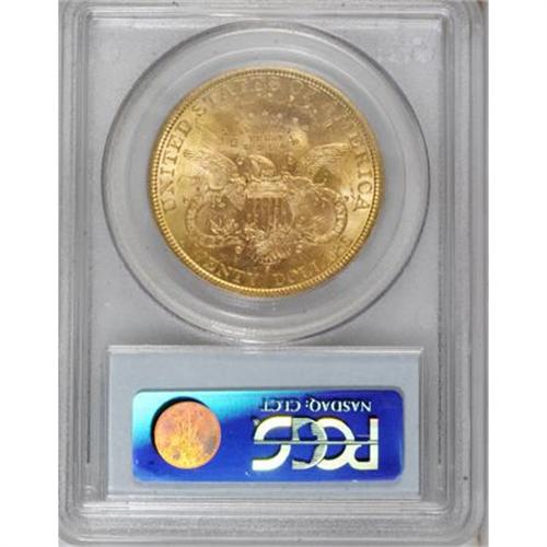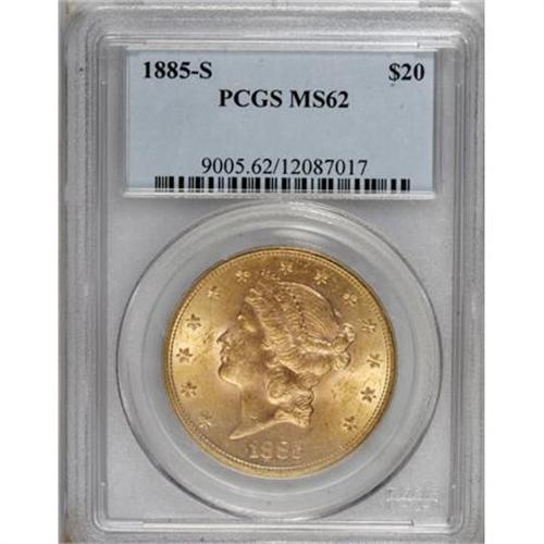 <B>1885-S $20 MS62 PCGS.</B></I> The most potent luster resides in the recesses of and the areas around the design elements. Peach-gold surfaces display exquisitely struck devices and are moderately abraded.<BR><BR><B>Coin Engraver:</B> James B. Longacre<BR><BR><b>Shipping:</b> Coins & Currency (<a target="_blank" href="http://www.heritageauctions.com/common/shipping.php">view shipping information</a>)