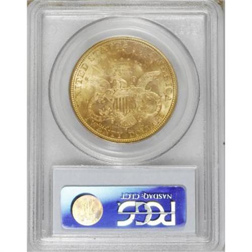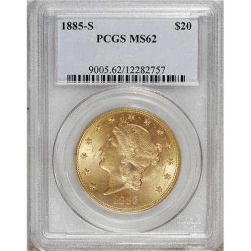 <B>1885-S $20 MS62 PCGS.</B></I> With only a casual glance, this piece appears Select as it has bold luster and warm, apricot-gold coloration. Closer inspection reveals some light marks including a reeding mark on Liberty's cheek, but this example is clearly exceptional for the grade.<BR><BR><B>Coin Engraver:</B> James B. Longacre<BR><BR><b>Shipping:</b> Coins & Currency (<a target="_blank" href="http://www.heritageauctions.com/common/shipping.php">view shipping information</a>)