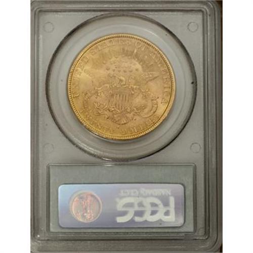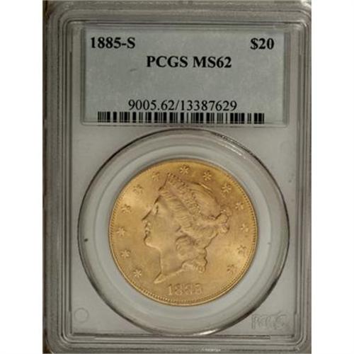 <B>1885-S $20 MS62 PCGS.</B></I> Vibrant luster with a touch of satin characterizes this lovely orange-gold S-mint double eagle. Though a number of wispy abrasions are noted in the fields, the overall eye appeal is suggestive of a finer grade.<BR><BR><B>Coin Engraver:</B> James B. Longacre<BR><BR><b>Shipping:</b> Coins & Currency (<a target="_blank" href="http://www.heritageauctions.com/common/shipping.php">view shipping information</a>)