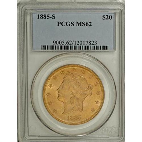 <B>1885-S $20 MS62 PCGS.</B></I> This orange-gold San Francisco double eagle is strongly lustrous with a touch of satin. The boldly impressed devices show few marks, though the fields display a number of tiny abrasions.<BR><I>From The York/Hallenbeck #2 Current Finest PCGS Registry Set of Liberty Double Eagles.</B></I><BR><BR><B>Coin Engraver:</B> James B. Longacre<BR><BR><b>Shipping:</b> Coins & Currency (<a target="_blank" href="http://www.heritageauctions.com/common/shipping.php">view shipping information</a>)