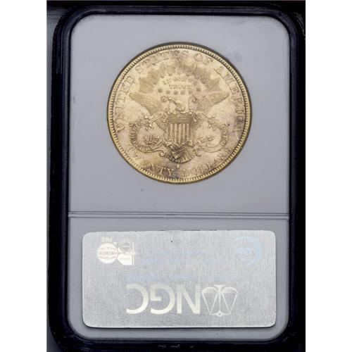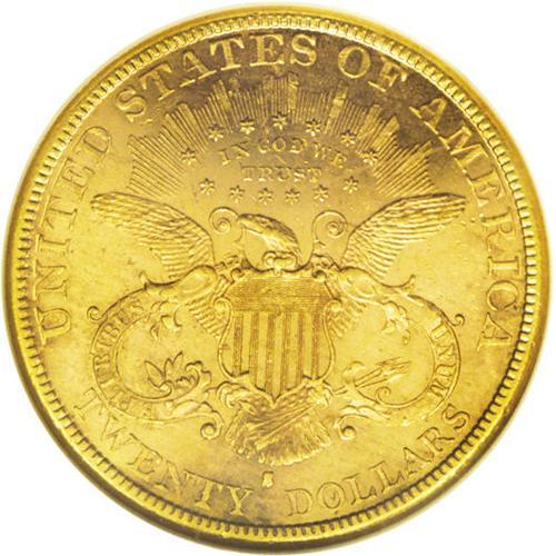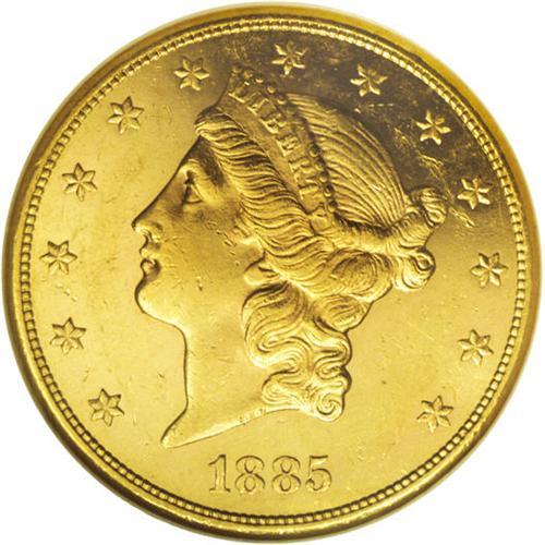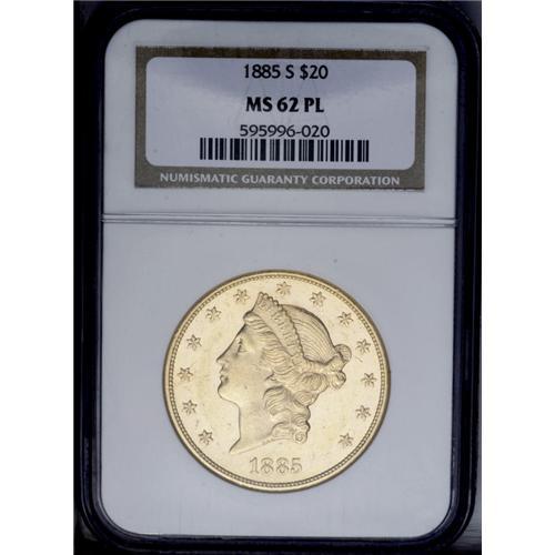 <B>1885-S<$20> MS62 Prooflike NGC.</B></I> Highly reflective with ochre fields and sharply struck straw-gold devices. The surfaces are surprisingly clean for the grade. NGC has certified only three pieces of this issue as prooflike, and the other two fall a point short of this magnificent example (7/06).<BR><I>From The New York Eye Appeal Collection.</B></I>