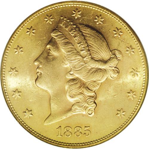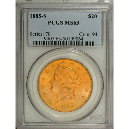 <B>1885-S $20 MS63 PCGS.</B></I> Like so many other dates in the Liberty double eagle series, this issue is a condition rarity, although not to the same extent as some years. This is an aesthetically pleasing example with frosty orange-gold luster. The surfaces are lightly abraded, consistent with the grade.<BR><BR><b>Shipping:</b> Coin/Currency (<a target="_blank" href="http://www.heritageauctions.com/common/shipping.php">view shipping information</a>)