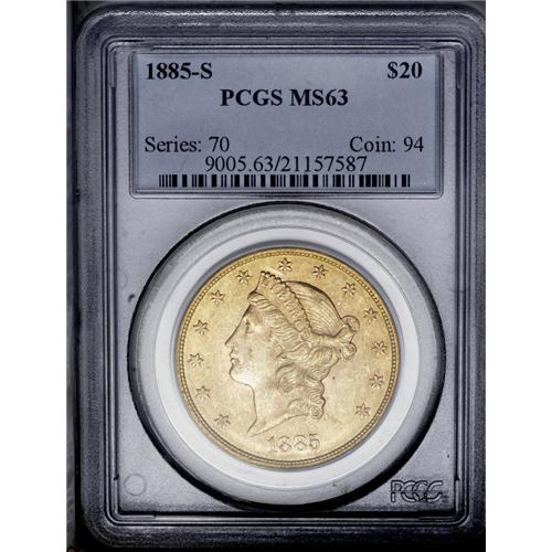 <B>1885-S<$20> MS63 PCGS.</B></I> Satiny and well frosted with minor luster grazes on the obverse and a few more noticeable field marks on the reverse. While always available in average Uncirculated condition, the 1885-S becomes increasingly scarce as one climbs the Mint State ladder with MS63 coins being the last rung of affordability for the collector. <BR><BR><B>Important notice:</B> Heritage usually auctions material at the rate of 200-250 lots per hour. On some occasions eBay Live bid software or the Internet may not be able to keep up with the pace of the auction. We recommend placing a realistic absentee bid now as insurance to avoid disappointment. Occasionally the auctioneer may eliminate or reject an eBay Live bid, and the auctioneer may also reopen a lot after the close of the eBay live bidding (usually because we missed an audience bid), and may reject your bid even if it shows you as the winning bidder. By bidding via eBay Live, you agree that Heritage may award the lot to another bidder at its sole discretion under the circumstances described above or any other reasonable circumstances. Since eBay bids are not shown to us until we open the lot on the floor, we treat those bids just like floor bids. In most cases the floor responds before the eBay bid is presented to us, due to Internet lag time, so for consistency we have made it a policy that floor bids are always considered first over tie eBay live bids. Also please note that all Heritage lots purchased through eBay Live carry a 20% Buyer's Premium. Please make sure you read the Terms and Conditions before you bid. This lot is being auctioned in conjunction with a live floor auction by Heritage Galleries & Auctioneers. All final auction and invoice information will be supplied by Heritage Galleries & Auctioneers, and all other information should be considered preliminary. Lot:4306 <BR><BR><B>Winning Notification and Billing:</B> After the FINAL session in this auction is complete, Heritage will send e-mail and snail mail invoices. This process normally takes several days. All final auction and invoice information will be supplied by Heritage Galleries & Auctioneers, and all other information should be considered preliminary. <BR><BR>This auction will be conducted on a live auction floor and over the Internet through eBay Live. If you choose to place an absentee bid, please take a moment to <font color='#0000ff'><u><a href='http://pages.ebay.com/liveauctions/help/before/laabsentee.html'>learn how eBay Live absentee bidding works</a></u></font><font color='#000000'>