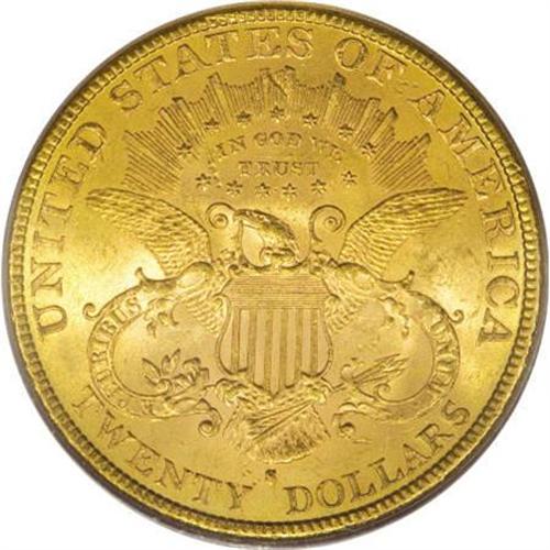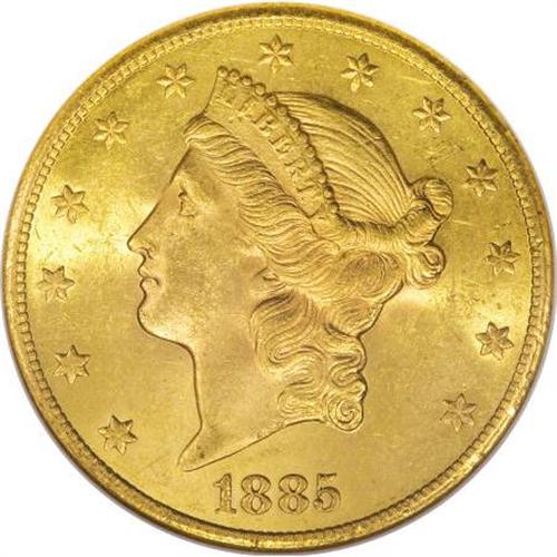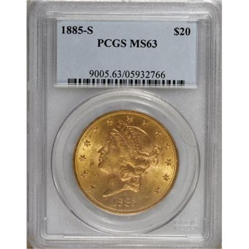 <B>1885-S $20 MS63 PCGS.</B></I> This lustrous Liberty twenty has olive-gold borders and apricot fields and devices. The strike is bold, with only slight blending of detail within the hair. The reverse field is surprisingly clean, and the portrait lacks the conspicuous abrasions often seen on these large bag-stored gold coins.<BR><BR><b>Shipping:</b> Coins & Currency (<a target="_blank" href="http://www.heritageauctions.com/common/shipping.php">view shipping information</a>)