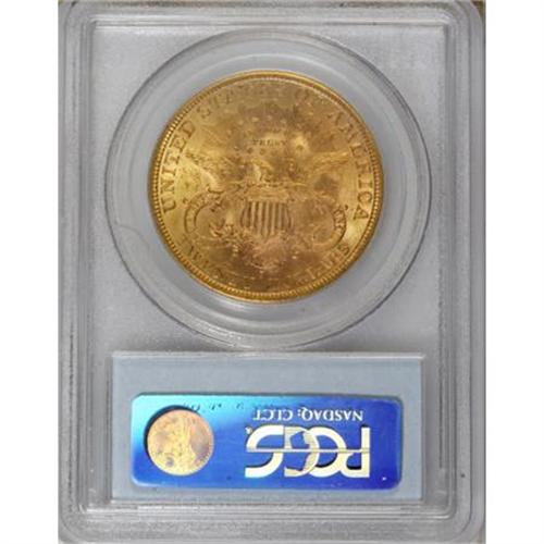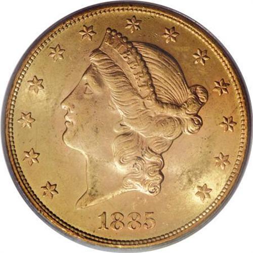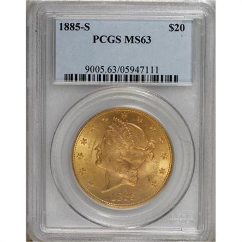 <B>1885-S $20 MS63 PCGS.</B></I> Like many of its brethren, this piece is a condition rarity with satiny luster and crimson-gold color. The surfaces have scattered marks as expected for the grade. Despite an adequately large mintage, few high quality pieces have survived as most went into circulation at the time of issue. PCGS has only examined 29 finer examples of this date (7/07).<BR><BR><B>Coin Engraver:</B> James B. Longacre<BR><BR><b>Shipping:</b> Coins & Currency (<a target="_blank" href="http://www.heritageauctions.com/common/shipping.php">view shipping information</a>)