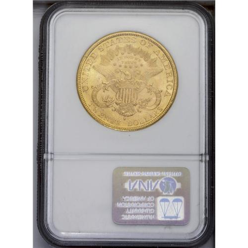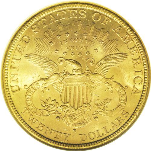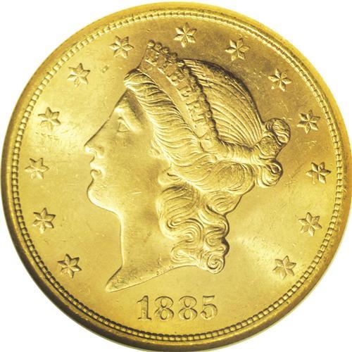<B>1885-S<$20> MS64 NGC.</B></I> Once the Carson City Mint ceased production early in 1885, the burden of gold production was concentrated on the San Francisco Mint. Philadelphia struck small quantities of proofs, but consequential business strike of gold coins did not again take place at the facility until 1888. Even San Francisco struck fewer double eagles than in prior years. Just 683,500 pieces were issued, and none were struck the following year. Uncirculated pieces are plentiful, however, until the MS63 level, at which point the 1885-S becomes scarce. Near-Gems are very rare, since indifferent storage abraded most examples. The present lustrous piece is only lightly abraded, without the usually encountered shiny cheek and scuffy fields. Census: 10 in 64, 0 finer (8/06).