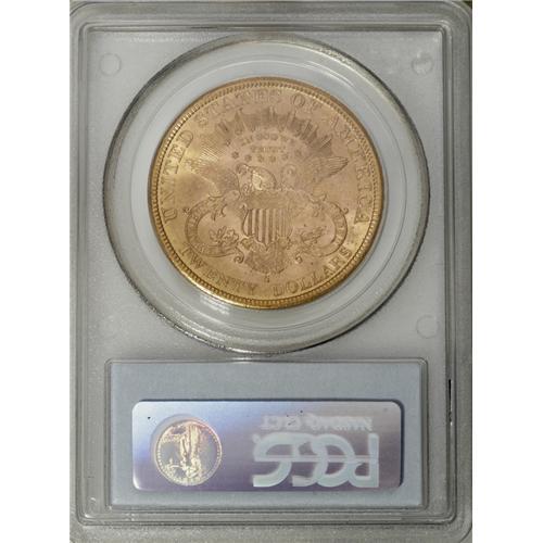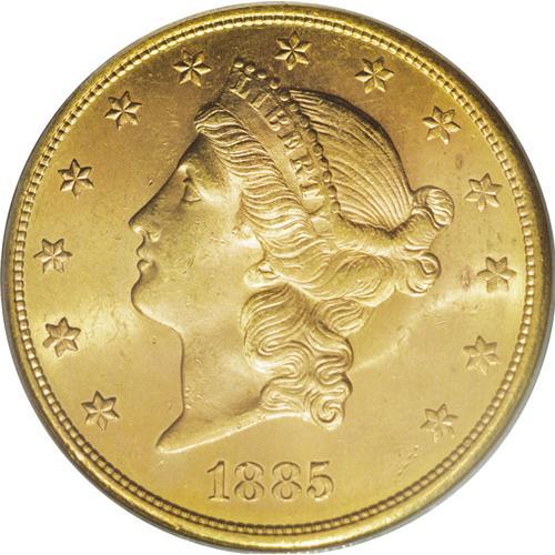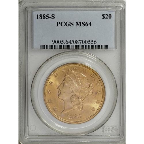 <B>1885-S $20 MS64 PCGS.</B></I> Once the California gold rush began in earnest, it wasn't long before the bulk of double eagle production became the responsibility of the newly opened San Francisco Mint. By 1856 the mintage of S-mint twenties exceeded one million pieces and output continued at a frantic pace throughout the Civil War. It is therefore extremely curious that no double eagles were struck in San Francisco in the year 1886. Offered here is a second Choice representative from the previous year. Like the coin just offered, this piece is well detailed and shows far fewer surface marks than is normally encountered for the issue.<BR><I>From The Kutasi Collection.</B></I><BR><BR><b>Shipping:</b> Coin/Currency (<a target="_blank" href="http://www.heritageauctions.com/common/shipping.php">view shipping information</a>)