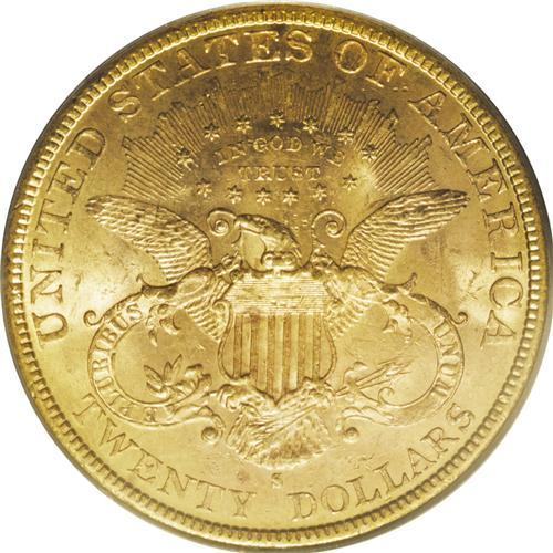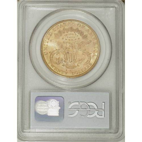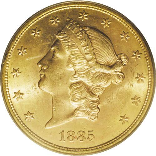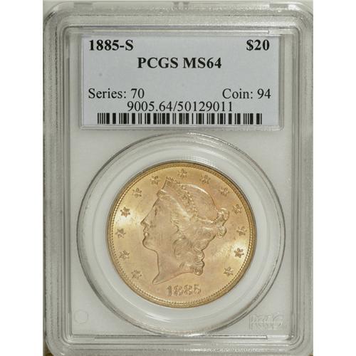<B>1885-S $20 MS64 PCGS.</B></I> This is an extraordinary near-Gem piece with bright pinkish-gold luster and frosty surfaces. It is sharply struck and nearly mark-free. Like most San Francisco Mint double eagles of this era, nearly the entire mintage entered circulation with few saved by collectors. Most numismatists that were active at the time had no interest in mintmarks, thus these coins were not saved. There were exceptions, of course. For example, just a few years later J.M. Clapp began ordering coins every year from the different branch mints. Population: 28 in 64, 1 finer (10/06).<BR><BR><b>Shipping:</b> Coin/Currency (<a target="_blank" href="http://www.heritageauctions.com/common/shipping.php">view shipping information</a>)