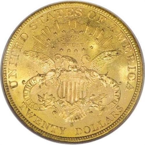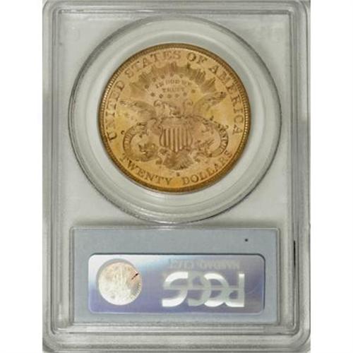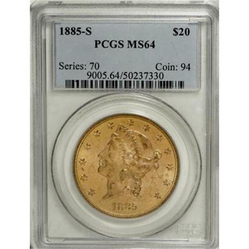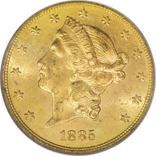 <B>1885-S $20 MS64 PCGS.</B></I> By 1886, commercial demand for double eagles on the West Coast was sated, and San Francisco struck no examples that year. The coins of the previous year, 1885, thus experienced heavier circulation than they would have otherwise, which had a direct impact on the number of Mint State survivors.<BR> This yellow-orange near-Gem offers swirling luster on the obverse and flashy reflectivity on the reverse. Well-defined overall with a hazy appearance and a few small copper spots on each side. A handful of small, scattered abrasions preclude a finer designation. Despite this issue's availability in better circulated and even lower Mint State grades, Select examples are elusive, and near-Gems are condition rarities. NGC has graded no finer representatives, while PCGS has certified just one such coin (7/07).<BR><BR><B>Coin Engraver:</B> James B. Longacre<BR><BR><b>Shipping:</b> Coins & Currency (<a target="_blank" href="http://www.heritageauctions.com/common/shipping.php">view shipping information</a>\)