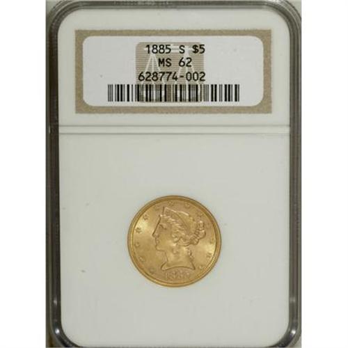 <B>1885-S $5 MS62 NGC.</B></I> NGC Census: (930/1060). PCGS Population (623/781). Mintage: 1,211,500. Numismedia Wsl. Price for NGC/PCGS coin in MS62: $340. (#8368)<BR><BR><b>Shipping:</b> Coins & Currency (<a target="_blank" href="http://www.heritageauctions.com/common/shipping.php">view shipping information</a>)
