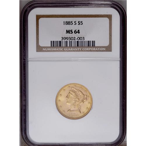 <B>1885-S<$5> MS64 NGC.</B></I> Light rose-gold centers are framed by lime-gold iridescence. This well preserved half eagle is from a relatively available issue, but is desirable since it is high-end for the grade.
