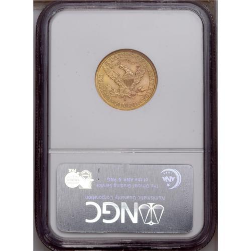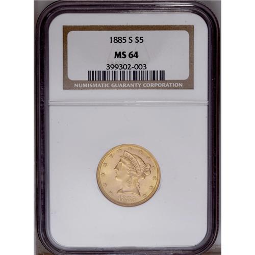<B>1885-S $5 MS64 NGC.</B></I> The smooth surfaces display an opaque coating of pastel coloration on each side, with a two-toned appearance and pleasing peach and mint-green patina. The striking details are quite bold and there are only two or three tiny nicks, on each side, that keep the piece from being pristine.