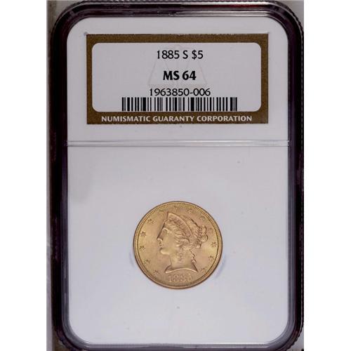 <B>1885-S<$5> MS64 NGC.</B></I> This is a no-questions near-Gem with thickly set, frosty luster and halos of greenish-gold color around the rims. The centers are golden-rose in shade, both sides are crisply impressed. There are no abrasions that are out of context with the assigned grade.