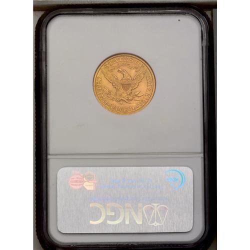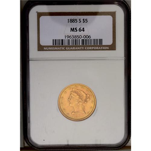 <B>1885-S<$5> MS64 NGC.</B></I> This is a no-questions near-Gem with thickly set, frosty luster and halos of greenish-gold color around the rims. The centers are golden-rose in shade, both sides are crisply impressed. There are no abrasions that are out of context with the assigned grade.