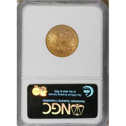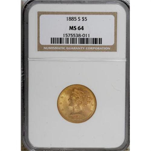 <B>1885-S $5 MS64 NGC.</B></I> Demand for gold coinage other than the double eagle fell during the early 1880s, but by 1885, production of S-mint half eagles was on its way back to its previous levels. This satiny and well-defined Choice piece has strong detail and attractively preserved peach-gold surfaces.<BR><BR><B>Coin Engraver:</B> Christian Gobrecht<BR><BR><b>Shipping:</b> Coins & Currency (<a target="_blank" href="http://www.heritageauctions.com/common/shipping.php">view shipping information</a>\)