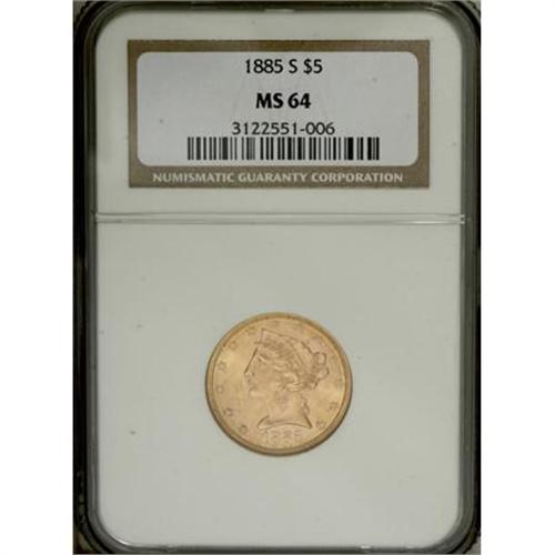 <B>1885-S $5 MS64 NGC.</B></I> NGC Census: (403/97). PCGS Population (291/32). Mintage: 1,211,500. Numismedia Wsl. Price for NGC/PCGS coin in MS64: $1,350. (#8368)<BR><BR><B>Coin Engraver:</B> Christian Gobrecht<BR><BR><b>Shipping:</b> Coins & Currency (<a target="_blank" href="http://www.heritageauctions.com/common/shipping.php">view shipping information</a>)