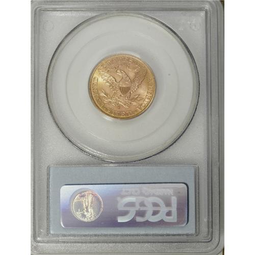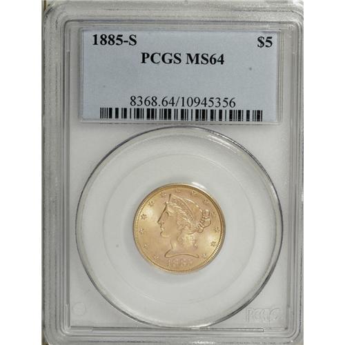 <B>1885-S $5 MS64 PCGS.</B></I> A well struck and rather satiny peach-gold near-Gem that has pale apricot accents. Few marks, though a handful of luster grazes are noted in the fields.<BR><BR><b>Shipping:</b> Coin/Currency (<a target="_blank" href="http://www.heritageauctions.com/common/shipping.php">view shipping information</a>)