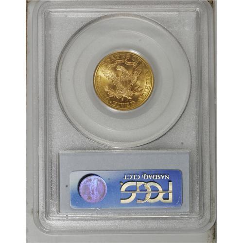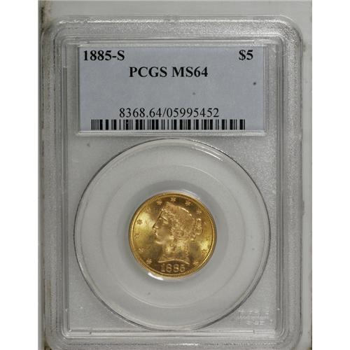 <B>1885-S $5 MS64 PCGS.</B></I> Choice and strongly lustrous with sharply struck straw-gold obverse devices. The yellow-orange fields, particularly on the reverse, have a few too many marks for this piece to be a Gem.<BR><BR><b>Shipping:</b> Coin/Currency (<a target="_blank" href="http://www.heritageauctions.com/common/shipping.php">view shipping information</a>)