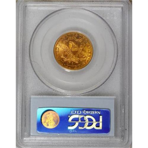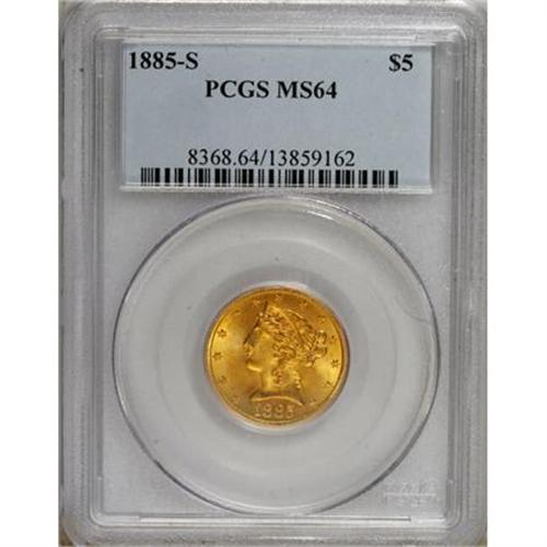 <B>1885-S $5 MS64 PCGS.</B></I> The depth of rose-gold coloration and the intensity of the accompanying luster ensure the alluring visual appeal of this near-Gem half eagle. A bit of greenish milkiness settles near the left obverse border, and a small number of trivial abrasions are scattered over each side. Extremely scarce any finer. <BR><BR><B>Coin Engraver:</B> Christian Gobrecht<BR><BR><b>Shipping:</b> Coins & Currency (<a target="_blank" href="http://www.heritageauctions.com/common/shipping.php">view shipping information</a>\)