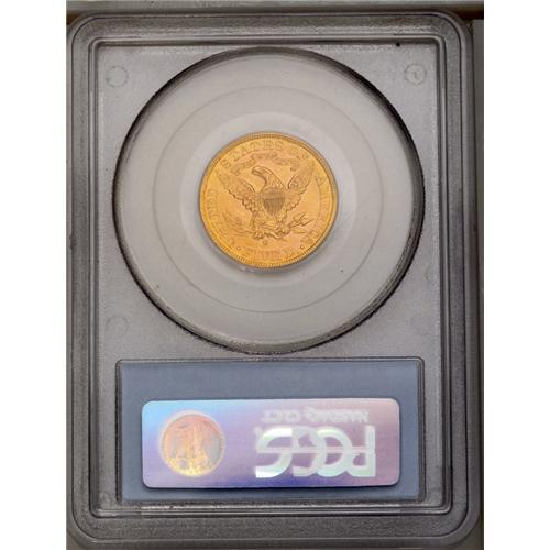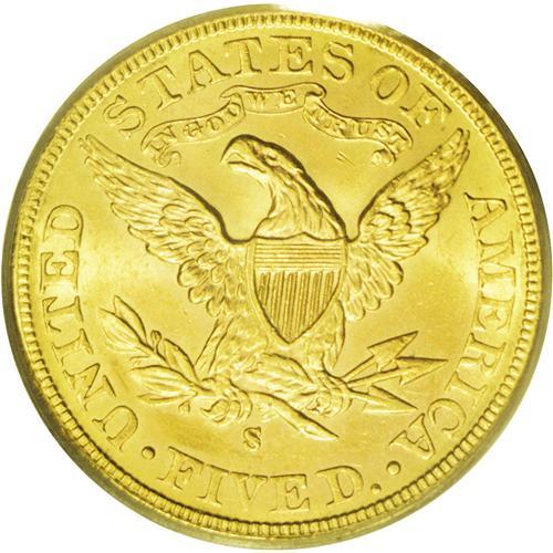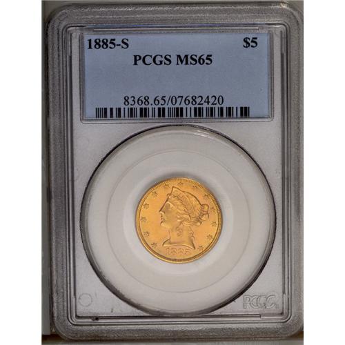 <B>1885-S<$5> MS65 PCGS.</B></I> A gorgeous Gem example and a condition rarity at this grade. Although over 1 million coins were produced, PCGS has only certified 22 Gems. This example has lovely orange-gold color with lighter lemon-yellow at the borders. It is nearly fully struck and the surfaces have only minimal abrasions. An outstanding example and an important opportunity for the advanced collector. Population: 19 in 65, 3 finer (5/06).