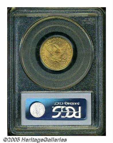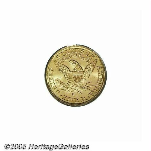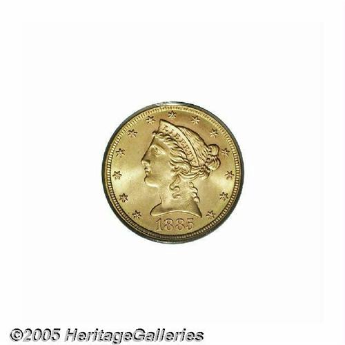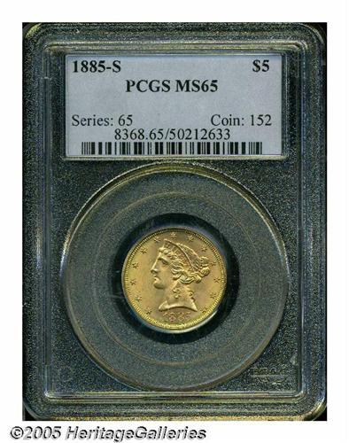 <B>1885-S<$5> MS65 PCGS.</B></I> Highly lustrous and sharply struck. This is a wonderful Gem, approaching honors as finest certified. It has brilliant pinkish-gold color and exceptional aesthetic appeal. Just the slightest surface marks keep this from a higher grade. Population: 17 in 65, 3 finer (5/05).