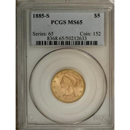 <B>1885-S $5 MS65 PCGS.</B></I> Highly lustrous and sharply struck. This is a wonderful Gem, approaching honors as finest certified. It has brilliant pinkish-gold color and exceptional aesthetic appeal. Just the slightest surface marks keep this from a higher grade. Population: 28 in 65, 4 finer (12/07).<BR><BR><B>Coin Engraver:</B> Christian Gobrecht<BR><BR><b>Shipping:</b> Coins & Currency (<a target="_blank" href="http://www.heritageauctions.com/common/shipping.php">view shipping information</a>)