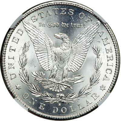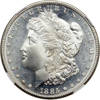 1885-S Morgan Dollar. NGC graded MS-66. A blast white Morgan with frosty devices. An appealing gem, an elegant design. Pop 13; none finer at NGC (PCGS # 7164) .