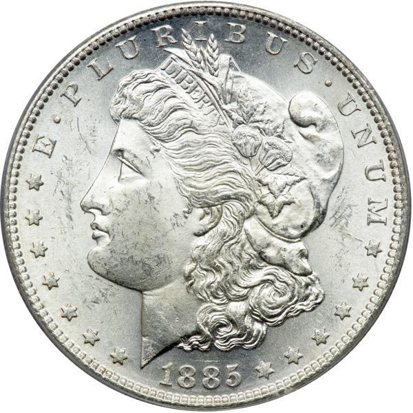 1885-S Morgan Dollar. PCGS graded MS-63. A nice white coin, gleaming with dancing luster (PCGS # 7164) .